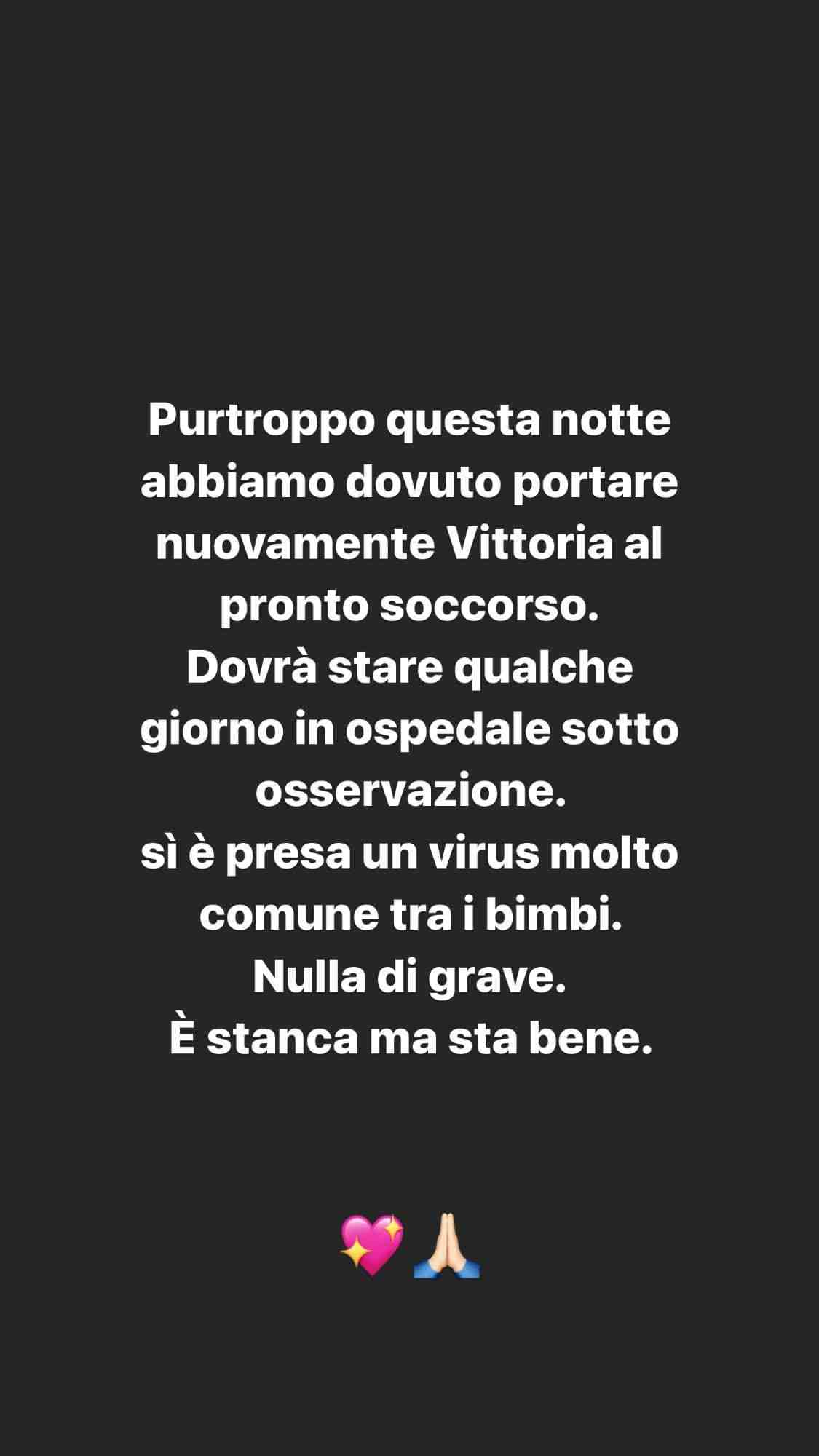 Attraverso una storia su Instagram Fedez ha così scritto: “Purtroppo questa notte abbiamo dovuto portare nuovamente Vittoria al pronto soccorso. Dovrà stare qualche giorno in ospedale sotto osservazione. Si è presa un virus molto comune tra i bimbi. Nulla di grave. E’ stanca ma sta bene”.