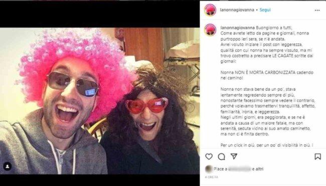 Secondo quanto afferma l’uomo la nonna sarebbe morta a causa di un malore fatale mentre era seduta accanto al caminetto, ma non ci sarebbe finita dentro bruciandosi. Ha voluto, poi, dare un ultimo messaggio da parte di Nonna Giovanna ai suoi follower: “Non siate tristi o disperati, non guardate al futuro con angoscia – ha affermato – Nonna non avrebbe voluto questo…ma che continuaste a ridere di tutte le ca**ate che diceva“.