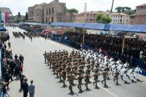 Parata militare ai Fori Imperiali, a Roma, in occasione delle celebrazioni del 2 Giugno, Festa della Repubblica. Festeggiamenti aperti, come da tradizione, dalla deposizione da parte del Capo dello Stato di una corona d’alloro sul Sacello del Milite Ignoto all’Altare della Patria. Alle 10.00, alla presenza del Presidente della Repubblica Sergio Mattarella e delle autorità civili e militari, è iniziata la sfilata delle Forze Armate e di Pace, seguite da quella di 300 sindaci. Novità di quest’anno la presenza, in qualità di ospiti d’onore, delle scolaresche che hanno partecipato a un concorso fra le scuole sulla Festa della Repubblica. Momento clou il sorvolo da parte delle Frecce Tricolori, eccellenza e vanto dell’Aeronautica Militare. Tuttavia si registrano le defezioni di alcuni generali, del Ministro della Difesa Ignazio La Russa e della leader di Fratelli d’Italia Giorgia Meloni in polemica con la Ministra della Difesa Elisabetta Trenta.