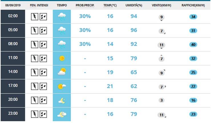 Al mattino coperto, con pioggia debole, al pomeriggio nubi sparse e schiarite, la sera nubi sparse con ampie schiarite, la notte sereno o poco nuvoloso.