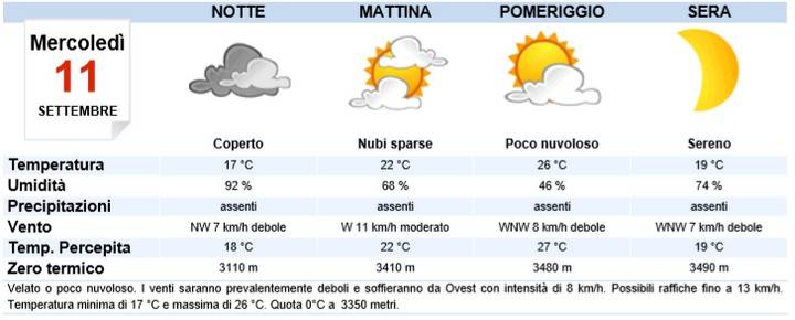 A Milano domani, mercoledì 11 settembre, bel tempo, con sole splendente per l’intera giornata. La giornata di domani la temperatura massima registrata sarà di 26°C, la minima di 17°C, lo zero termico si attesterà a 3350 m. I venti saranno al mattino assenti o deboli e proverranno da Ovest-Sudovest, al pomeriggio assenti o deboli e proverranno da Sudovest. Nessuna allerta meteo presente.