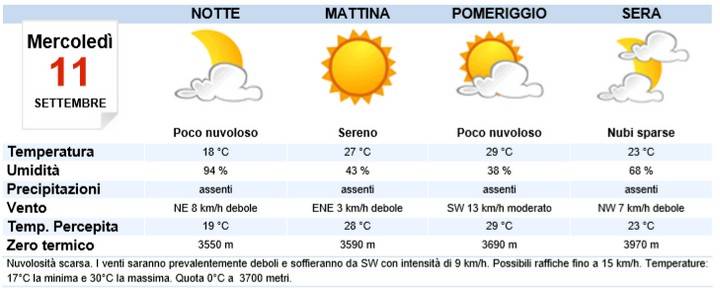 A Roma domani, mercoledì 11 settembre, i cieli in prevalenza poco nuvolosi, salvo variabilità nelle ore centrali della giornata. Durante la giornata di domani la temperatura massima registrata sarà di 30°C, la minima di 17°C, lo zero termico si attesterà a 3700 mI venti saranno al mattino deboli e proverranno da Nord-Nordest, al pomeriggio assenti o deboli e proverranno da Sud. Nessuna allerta meteo presente.