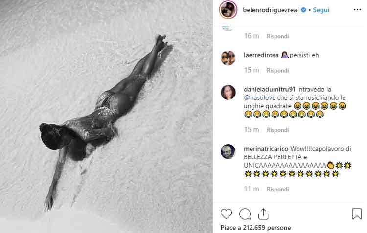 E’ da diversi giorni che la bella argentina, in vacanza con il suo compagno Stefano De Martino, pubblica sul suo profilo instagram numerose foto che la ritraggono in tutto il suo splendore. Qualche ora fa, la Rodriguez ha postato su Instagram una splendida foto in cui si mostra immersa nella sabbia bianca con un mini bikini. La foto attualmente ha raggiunto i 212.659 mi piace.