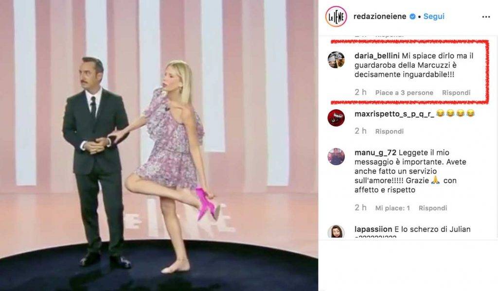 Durante la trasmissione c’è stato un simpatico siparietto tra i due conduttori che come si vede nel video si sfidano ai palleggi. Tra i vari commenti divertenti dei followers delle Iene, ne spicca uno che va in contro tendenza manifestando un chiaro disappunto sulla scelta del vestito della conduttrice. L’utente scrive: “Mi spiace dirlo ma il guardaroba della Marcuzzi è decisamente inguardabile!!!”