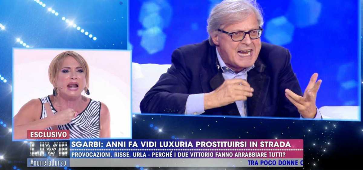 Vittorio Sgarbi non si smentisce mai. Ospite a Live-Non è la D’Urso, il critico d’arte è stato protagonista di un “colorito” e vivace scambio di battute con Vladimir Luxuria. Tutto è nato da una recente dichiarazione di Sgarbi, confermata nel salotto della D’Urso, nella quale il critico d’arte faceva riferimento al fatto che l’ex parlamentare di Rifondazione Comunista un tempo si prostituiva. Sgarbi precisa poi di averlo appreso leggendo un’intervista rilasciata dalla Luxuria al Corriere della Sera e soprattutto di averla sorpresa una sera negli anni ’80 mentre batteva il marciapiede. Vladimir Luxuria ha decisamente negato specificando che in quella sera Sgarbi ha equivocato tutto e scatenando di conseguenza la furiosa reazione di Sgarbi che la travolge con una mitragliata di “Non battevi?Non lo hai mai fatto?“.