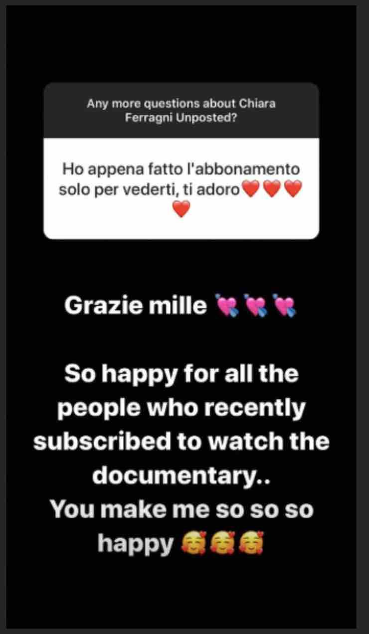 Sono tanti infatti i momenti che Chiara ha dedicato ai suoi fan in vista del lancio di ‘Unposted’ sulla piattaforma: l’influencer ne ha approfittato per chiarire i dubbi in merito all’abbonamento e in generale al funzionamento di Prime Video. Non sono mancati i messaggi di affetto e le promesse, da parte degli utenti, di vedere o rivedere il docufilm.
