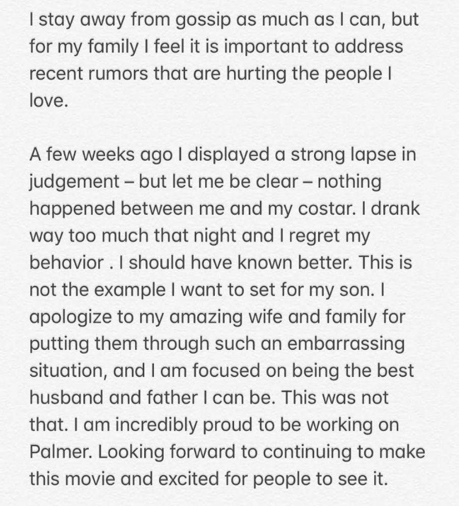 L’uomo ha giurato che tra lui e l’attrice Alisha Wainwright non è scattato il tradimento e dichiara che quella sera, in cui è stato fotografato insieme alla donna, aveva bevuto molto.