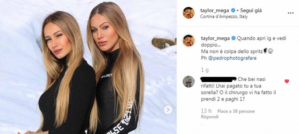 Tra i tantissimi commenti arrivati all’influencer, però, vi è un follower che ha notato la particolare somiglianza tra la Mega e sua sorella in particolar modo ha notato il naso di Taylor e ha scritto: “Che bei nasi rifatti! Lhai pagato tu a tua sorella? O il chirurgo vi ha fatto il prendi 2 e paghi 1?”.