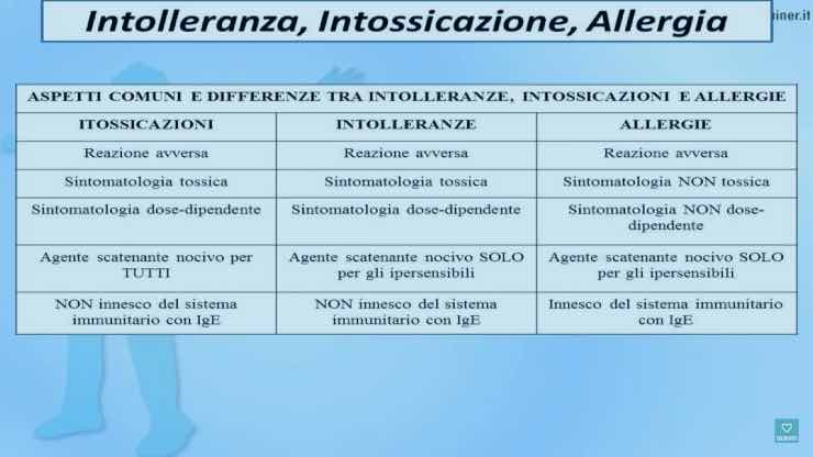 Queste si differenziano dalle allergie, non tanto per i sintomi che spesso possono essere simili, ma perché non coinvolgono il sistema immunitario. Colui che soffre infatti di intolleranza alimentare, ritroverà in alcuni casi i medesimi sintomi degli allergici ma con debite differenze, ovvero: