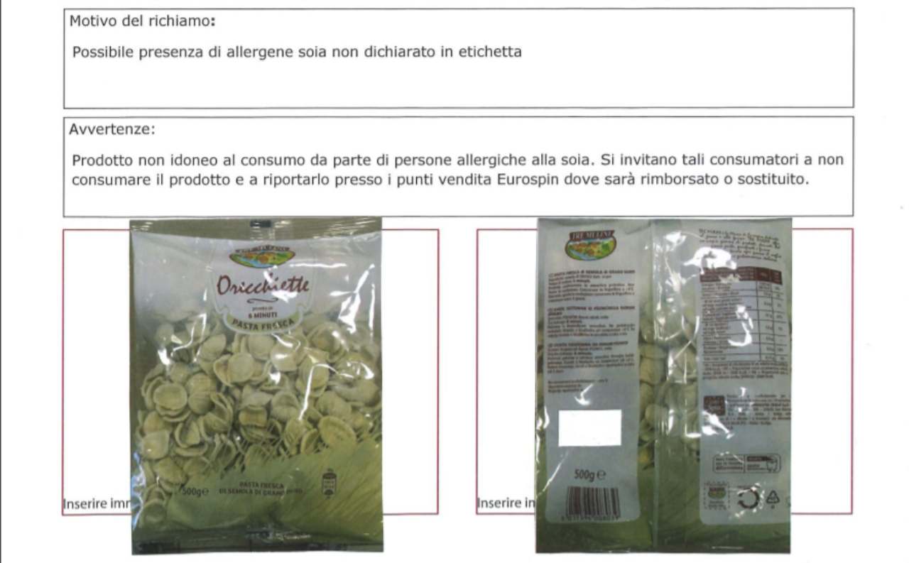 In particolare, le “Orecchiette – pasta fresca” e gli “Strozzapreti – pasta fresca”, sempre marchio “Tre Mulini” sono “Prodotti non idonei al consumo da parte di persone allergiche alla soia. Si invitano tali consumatori a non consumare il prodotto e a riportarlo presso i punti vendita Eurospin dove sarà rimborsato o sostituito”.