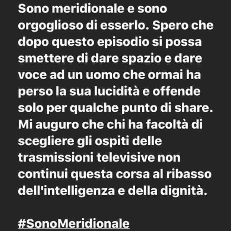 Nel suo post infatti, il cantautore napoletano scrive: “Sono meridionale e sono orgoglioso di esserlo. Spero che dopo questo episodio si possa smettere di dare spazio e dare voce ad un uomo che ormai ha perso la sua lucidità e offende solo per qualche punto di share.”