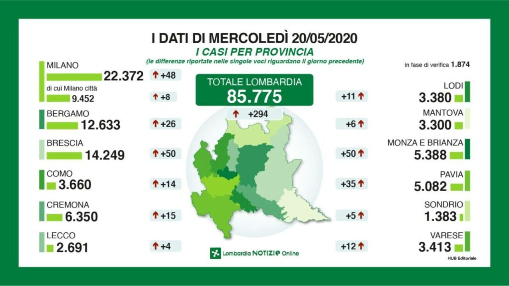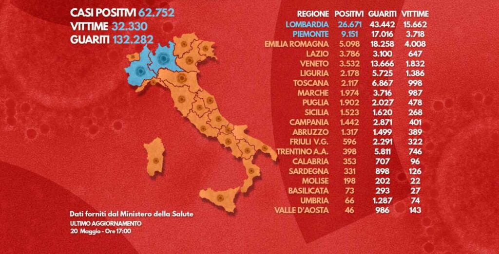 I nuovi dati della Protezione civile di mercoledì 20 maggio.