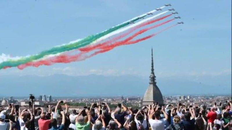 Il sobrio capoluogo piemontese non ha resistito alla tentazione di fare festa: folla da stadio in centro e lungo il Po per assistere allo spettacolo delle Frecce Tricolori.