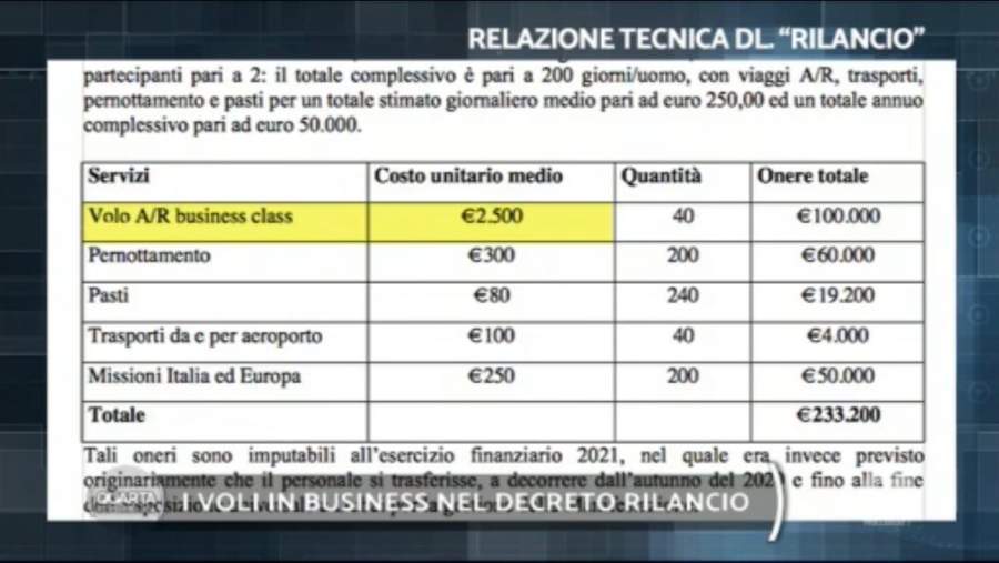 Vengono previsti 40 viaggi in business class. Ogni volo costa 2.500 euro, per un totale di 100mila euro a cui ne vanno aggiunti altri 133 mila per pasti e trasporti.