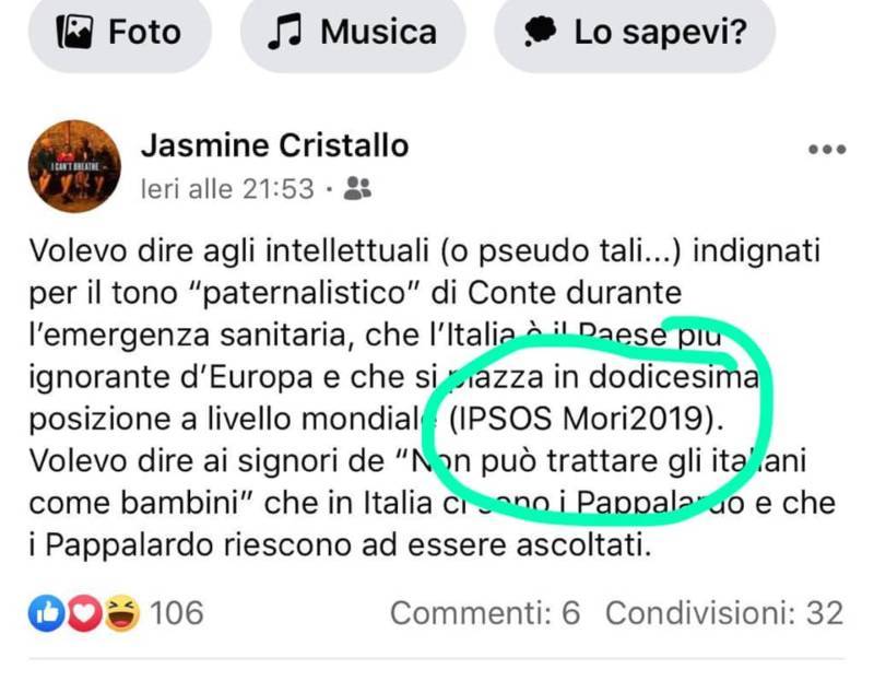 Sul suo profilo Jasmine si è scagliata contro gli intellettuali indignati per il tono ‘paternalistico’ di Conte durante l’emergenza sanitaria. A loro intendeva ricordare “che l’Italia è il Paese più ignorante d’Europa e che si piazza in dodicesima posizione a livello mondiale”. E che in Italia “ci sono i Pappalardo e che i Pappalardo riescono ad essere ascoltati”.
