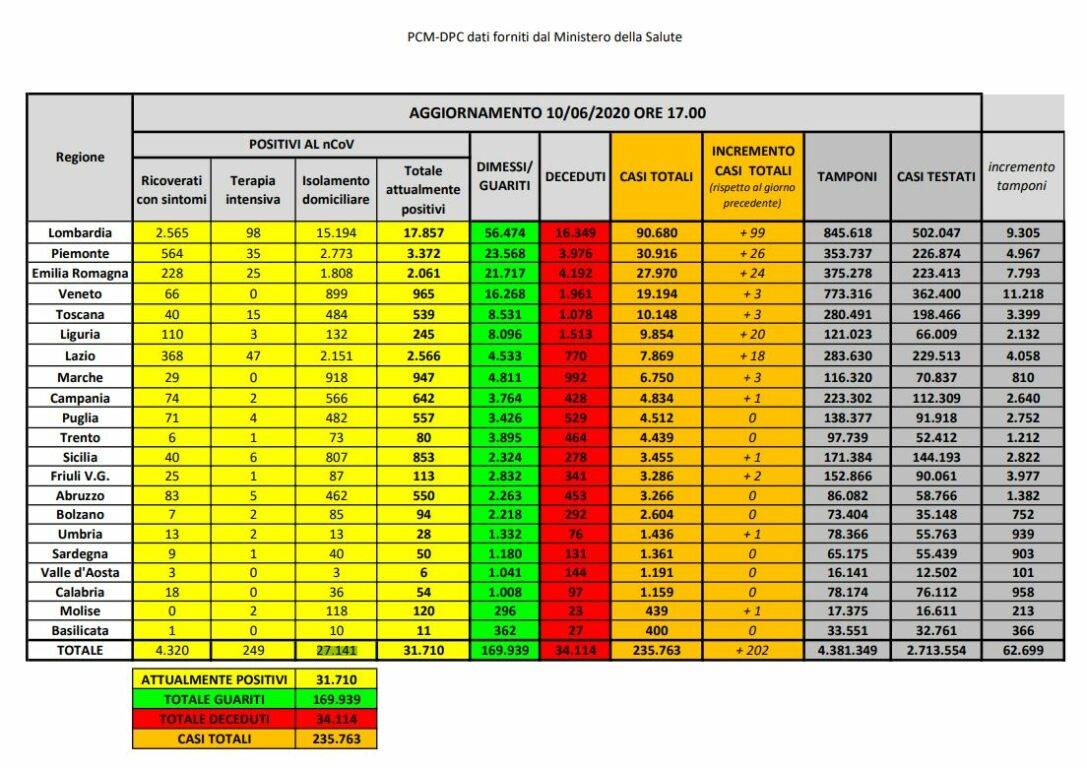 Coronavirus in Italia. I dati del 10 giugno diramati dalla Protezione civile.