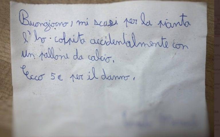 “Buongiorno, mi scusi per la pianta. L’ho colpita accidentalmente con un pallone da calcio. Ecco cinque euro per il danno” si legge nel bigliettino scritto a mano con tanto di firma del piccolo.