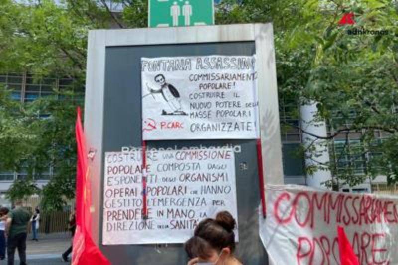 E ne ha portate diverse anche in via Gioia: su un cartello la scritta “Fontana Assassino, commissariamento popolare!” campeggia sotto il palazzo della Regione con tanto di fantoccio di Fontana rappresentato come una statua da tirare giù.