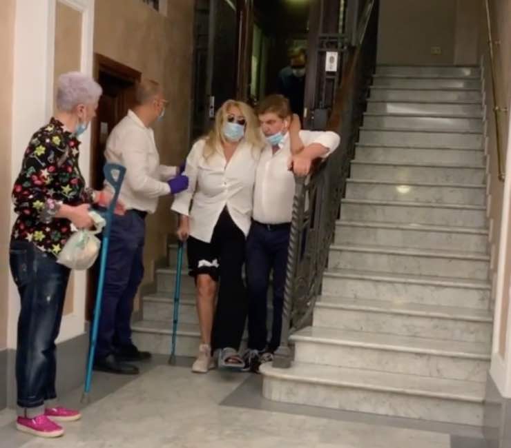 I fan avrebbero infatti anche dimenticato tale particolare, con la Venier sempre in gran forma, se non fosse per un video a sorpresa girato da suo marito Nicola Carraro, che la vede scendere le scale, stampelle alla mano ed aiutata.