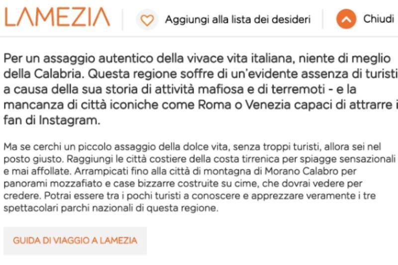 “Per un assaggio autentico della vivace vita italiana, niente di meglio della Calabria. Questa regione soffre di un’evidente assenza di turisti a causa della sua storia di attività mafiosa e di terremoti – e la mancanza di città iconiche come Roma o Venezia capaci di attrarre i fan di Instagram” si legge nella scheda descrittiva attira turisti.