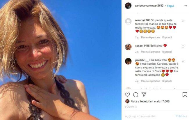 Le due si stanno godendo qualche giorno di relax al mare e lo scatto che ha fatto emozionare un pò tutti è quello in cui Carlotta sorridente ha la manina della piccola Stella sul suo cuore.