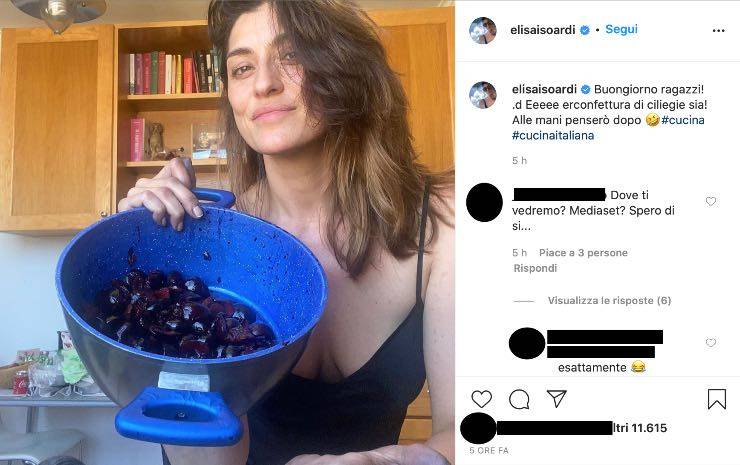 Questa volta, come detto in precedenza e come si può vedere dallo scatto postato in alto, la conduttrice si è mostrata senza trucco, con una canotta davvero molto scollata e con una pentola piena di ciliegie tra le mani.