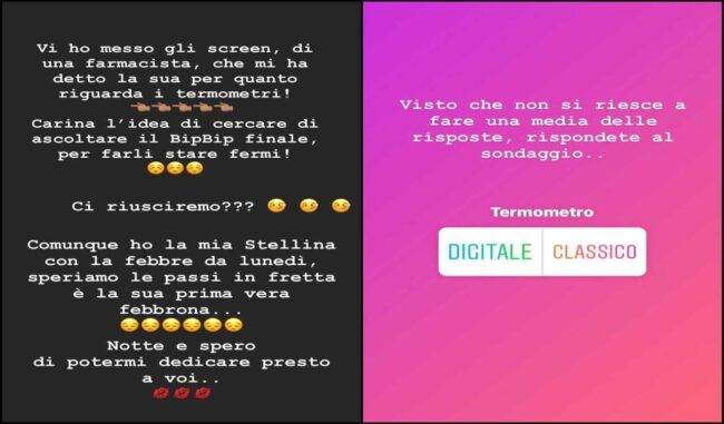 Classico, digitale o frontale? Le risposte sono state molte e per facilitarsi la vita, Costanza ha creato dei veri e propri sondaggi per raccogliere le idee. Alla fine arriva in soccorso una farmacista che spiega i pro e i contro di ogni termometro, dando proprio un consiglio utile che Costanza decide di condividere con tutti i suoi follower, così da poter essere di aiuto anche ad altre persone.