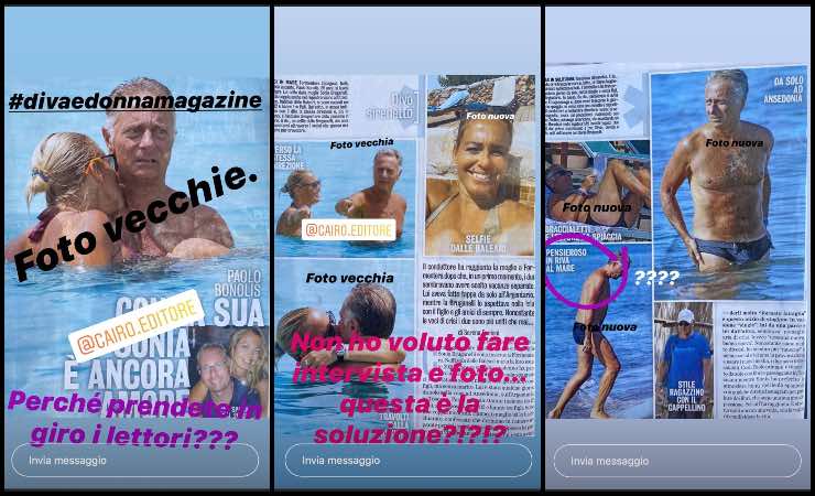 Per mettere insieme l’intero pezzo, come spiga la nota imprenditrice, sono state utilizzate fotografie vecchie: “Non ho voluto fare intervista e foto… questa è la soluzione?”. Negli scatti, la nota Bruganelli è in compagnia di Bonolis e già il primo scatto postato viene bollato come “Foto vecchie”.