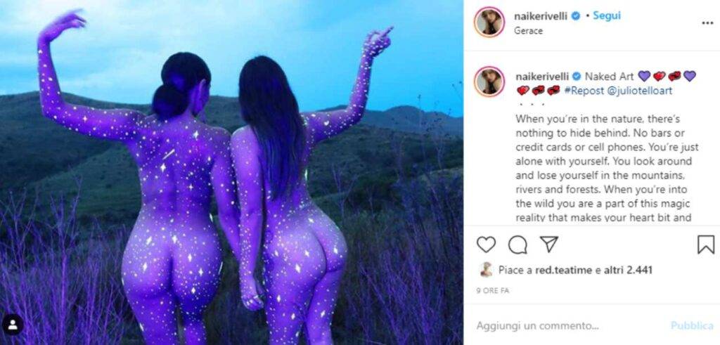 L’ultimo scatto apparso sul suo profilo di Instagram è una provocazione bella e buona. Insieme a lei, c’è proprio mamma Ornella. Le due donne sono immerse nella natura e sono completamente nude. La fotografia, modificata poi da un artista, mette in evidenza il corpo femminile e pressoché perfetto delle due donne.