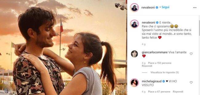 Neva ha così annunciato il matrimonio: “E niente…Pare che ci sposiamo” ha scritto su Instagram “Sposerò l’uomo più incredibile che si sia mai visto al mondo…e sono tanto, tanto felice. “Ha detto SÌ!” ha scritto Claudio Colica scegliendo per l’annuncio la stessa foto della sua promessa sposa.