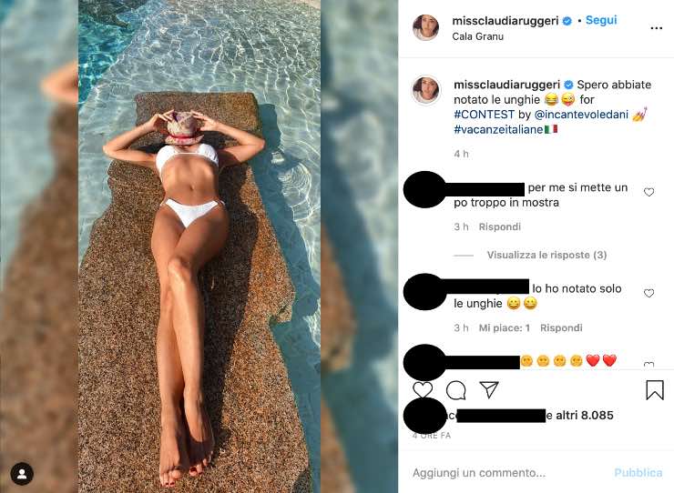 Lo scatto è condito da una divertente didascalia scritta dalla stessa Claudia che recita: “Spero abbiate notato le unghie for #CONTEST by @incantevoledani #vacanzeitaliane”.