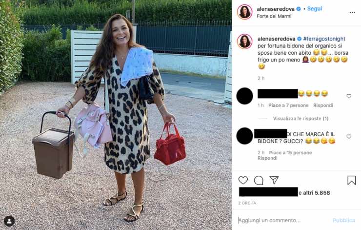 Nel testo della didascalia che accompagna il post, infatti, è possibile leggere: “#ferragostonight per fortuna bidone del organico si sposa bene con abito… borsa frigo un po meno”.
