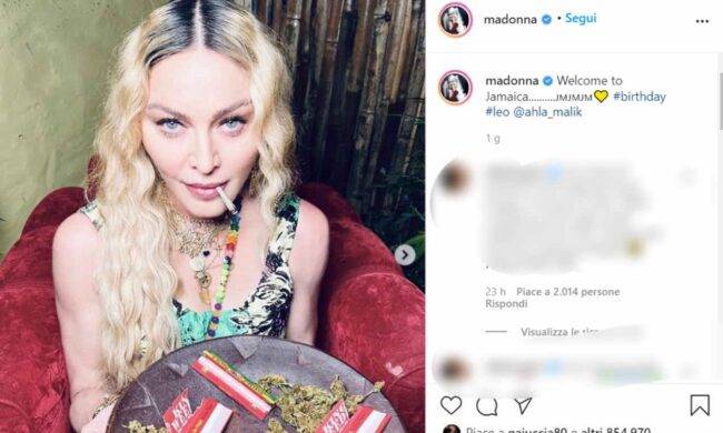“Welcome to Jamaica” questa la didascalia di una delle foto che ha scelto di pubblicare Madonna, nella quale vediamo la Ciccone con uno spinello in bocca e un vassoio colmo di droga e cartine.
