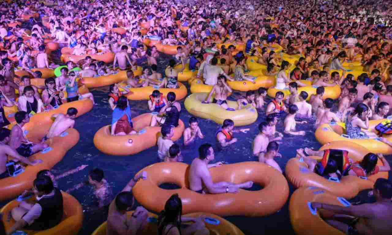 Tightly packed crowds in a water park in the Chinese city of Wuhan, where the coronavirus first emerged in December 2019 as life heads back to normal in Wuhan.