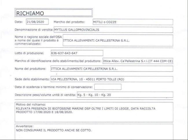 Un secondo richiamo che risale a ieri, 20 agosto, riguarda mitili o cozze commercializzate da “Società agricola Angelo Mancin” con sede dello stabilimento in Viale della Repubblica n.147, loc. Scardovari di Porto Tolle (Ro).