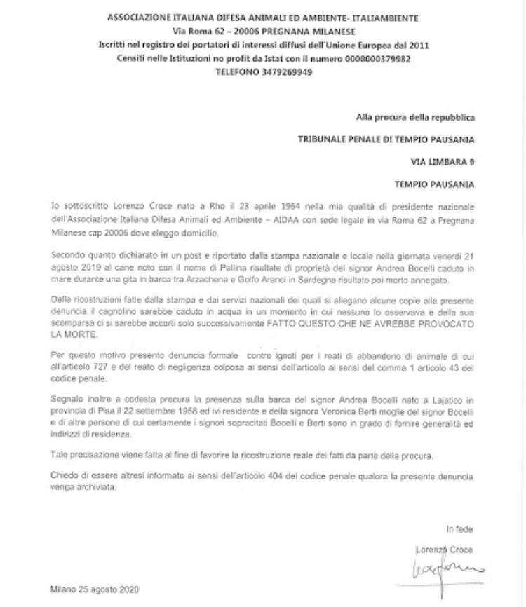 “Dalle ricostruzioni fatte dalla stampa e dai servizi nazionali televisivi dei quali si allegano alcune copie alla presente denuncia il cagnolino sarebbe caduto in acqua in un momento in cui nessuno lo osservava e della sua scomparsa ci si sarebbe accorti solo successivamente, fatto questo che ne avrebbe provocato la morte”, una parte della denuncia presentata al Tribunale Penale di Tempio Pausania.