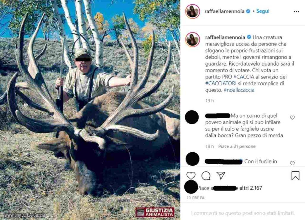 Raffaella Mennoia è decisamente contro la caccia, come si può apprendere dal suo ultimo post pubblicato su Instagram. L’immagine, scabrosa, di un cacciatore immortalato con il cadavere di un grande esemplare di alce sicuramente fa riflettere.