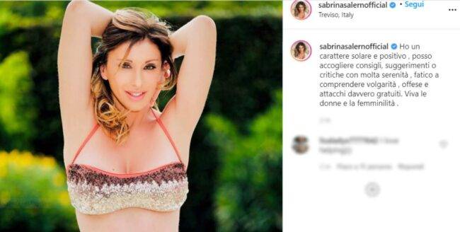 “Ho un carattere solare e positivo, posso accogliere consigli, suggerimenti o critiche con molta serenità, fatico a comprendere volgarità, offese e attacchi davvero gratuiti. – spiega Sabrina nella didascalia del suo scatto – Viva le donne e la femminilità.”