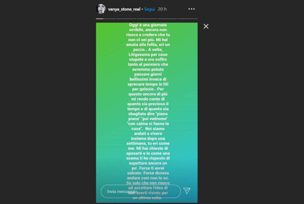 Quella di ieri è stata una giornata orribile per Vanya Stone, la tatuatrice romana e studentessa di recitazione, che fu esclusa dal programma La Pupa e il Secchione. Sul suo profilo Instagram, attraverso le stories, ha fatto sapere che è venuto a mancare un suo vecchio amore, un ex fidanzato che non ha mai dimenticato.