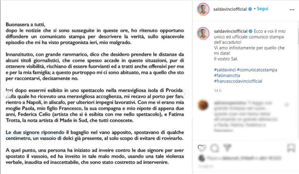 A questo punto Sal Da Vinci ha deciso di intervenire in difesa delle due donne, affermando di essersi rivolto al signore in questione in questo modo: “Guardi non è il caso, non è successo niente, non è l modo per rivolgersi a due signore.”