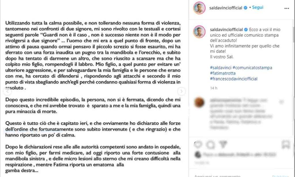 Padre e fglio, dopo aver rilasciato le loro dichiarazioni alla polizia, si sono recati in ospedale. Sal Da Vinci riporta una contusione alla mandibola sinistra, delle micro lesioni allo sterno che gli procurano difficoltà nella respirazione. Un ematoma alla gamba destra per Fatima Trotta.
