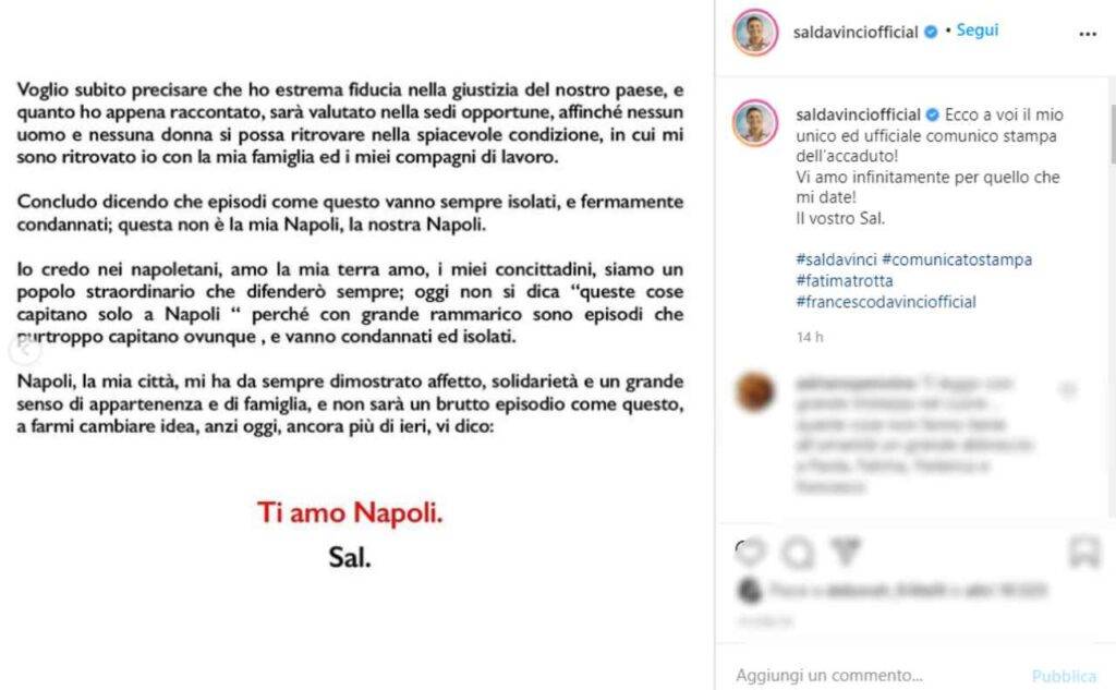 “Dopo questo incredibile episodio, la persona, non si è fermata, dicendo che mi conosceva, e che mi avrebbe trovato e sparato a me e la mia famiglia, quindi una pura minaccia di morte” sottolinea Sal Da Vinci.