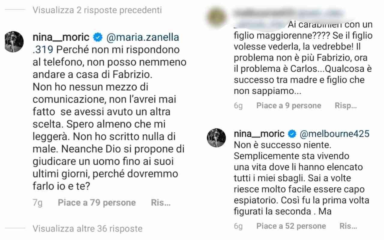 Nina, sollecitata dalle domande dei suoi follower preoccupati per lei ha svelato: “Non è successo niente. Sta vivendo una vita dove gli hanno elencato i miei sbagli” aggiungendo “Sai a volte riesce molto facile essere capo espiatorio. Così fu la prima volta, figurati la seconda.”