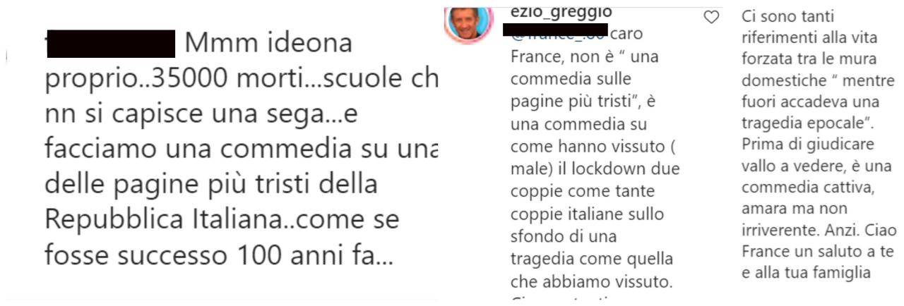 Il nuovo film di Enrico Vanzina, Lockdown all’italiana, uscirà nelle sale ad ottobre e vedrà protagonisti Paola Minaccioni, Ricky Memphis, Martina Stella ed Ezio Greggio. Proprio quest’ultimo è stato criticato su Instagram da un utente per la scelta di questo film in questo dato momento storico.
