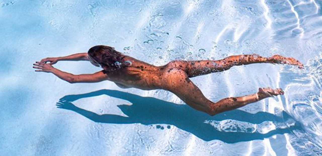 Nuda in piscina è più sensuale che mai: il vedo non vedo dell’acqua, i lunghi capelli sciolti, la didascalia scelta per lo scatto non potrebbe essere più azzeccata: freedom, libertà.