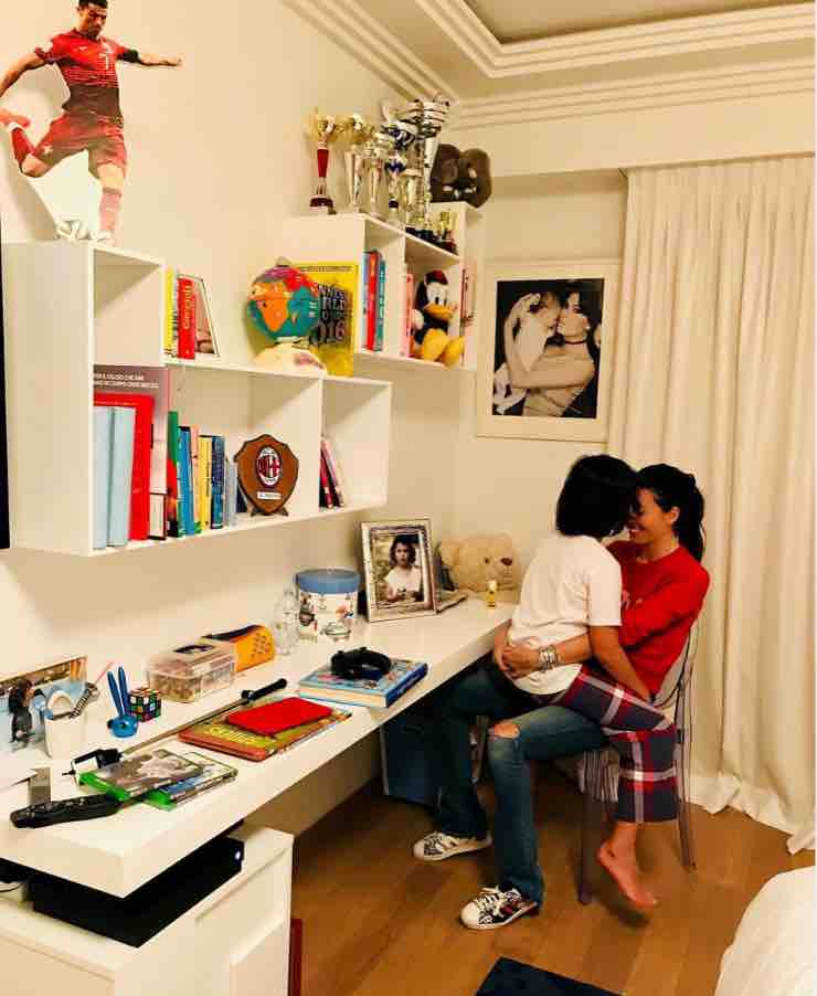 Come si può vedere dallo scatto messo in evidenza, il suo salotto è davvero meraviglioso, infatti, si possono ammirare splendidi tappeti con forme geometriche, grandi tende molto chiare e per gustarsi uno splendido film oppure una serie televisiva, un grandissimo divano bianco che, almeno in fotografia, sembra davvero molto morbido e confortevole.