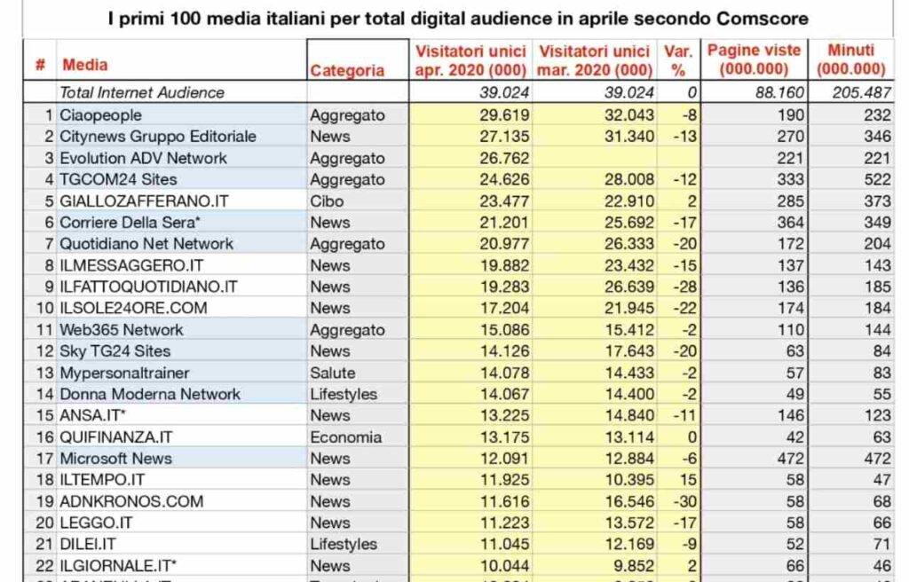 Subito dopo, e con una piccola differenza nei numeri, c’è il gruppo Web365. 362.000 sono gli utenti che separano il network dal quinto posto della blasonata Tgcom. Il gruppo editoriale Web365 è “in crescita del 18%, a 21,5 milioni di visite”. A maggio 2020 il gruppo editoriale si attestava sui 17.224.000 visitatori unici. Un aumento in pochi mesi del 21%.