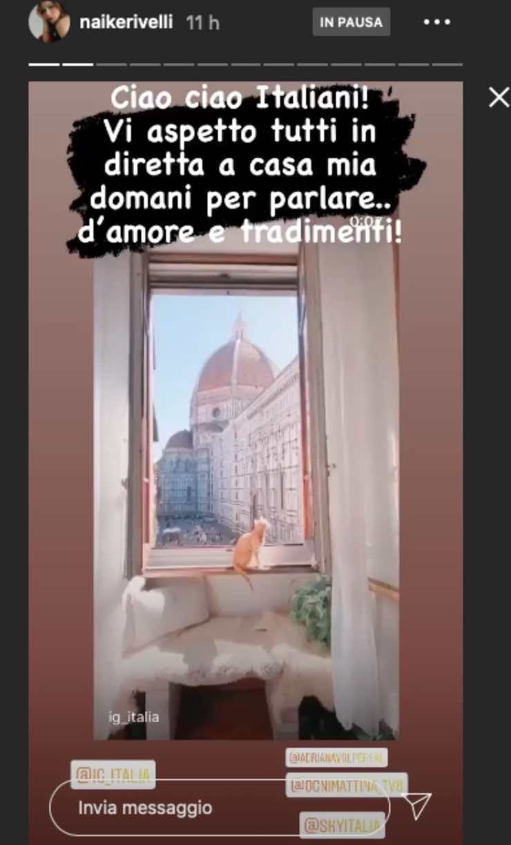 In questa occasione, Naike è chiamata a dire la sua su un tema che ha preannunciato proprio attraverso le stories del suo canale: “Ciao ciao italiani! Vi aspetto tutti in diretta a casa mia domani per parlare… d’amore e tradimenti!”.