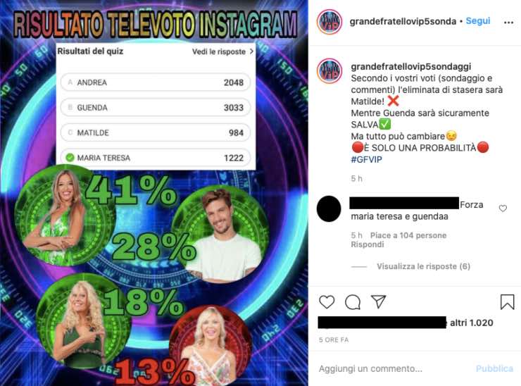 Intanto, la pagina Instagram “Grande Fratello Vip 5 Sondaggi” svela l’esito di un sondaggio, per l’appunto, a cui ha partecipato i fan della pagina, per sondare le preferenze tra i personaggi in nomination e capire chi si salverà e chi verrà invece eliminato.