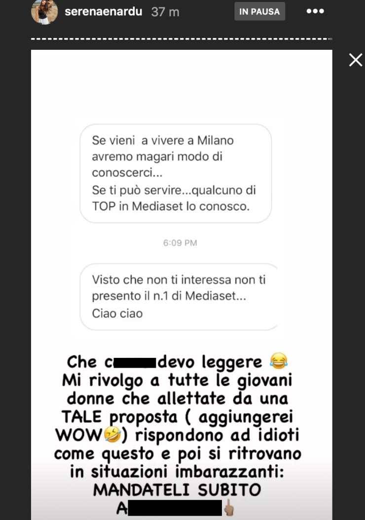 I messaggi che la Enardu mostra ai suoi follower recitano: “Se vieni a vivere a Milano avremmo magari modo di conoscerci… Se ti può servire… qualcuno di TOP in Mediaset lo conosco” – poi il messaggio continua – “Visto che non ti interessa non ti presento il n. 1 Mediaset… Ciao ciao“.